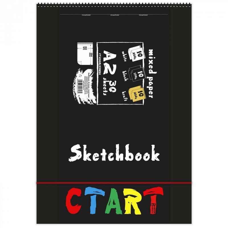 Format A2 (420x594 mm), 30 coli, 10 coli carton alb 250g, 10 coli carton kraft 250g, 10 coli carton negru 170g, inchidere cu elastic.
