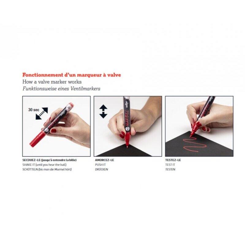 Inainte de utilizare agitati bine markerul apoi apasati pe varf pana se vede culoarea si gata il puteti utiliza.