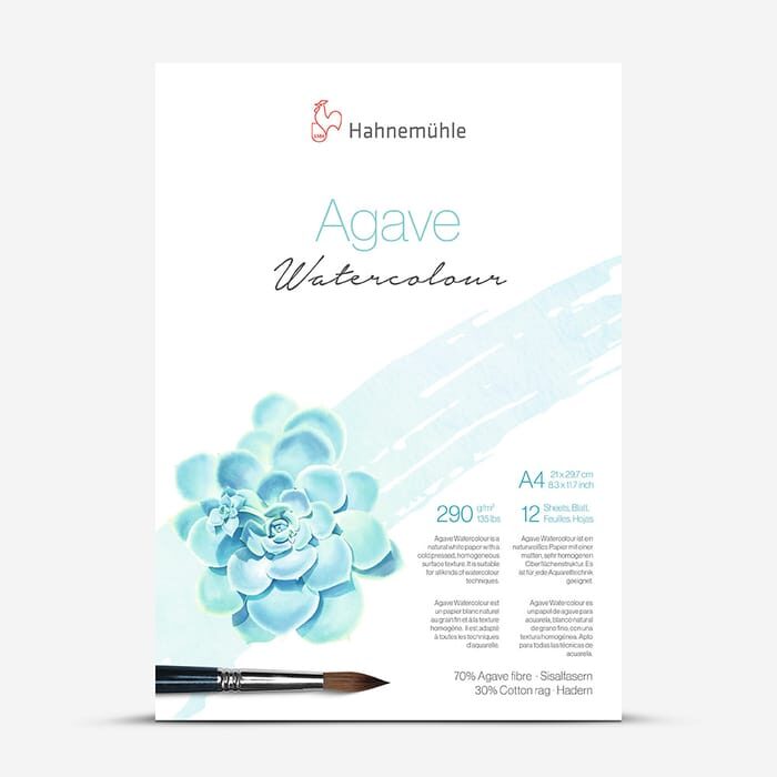 Blocul de acuarelă Hahnemühle Agave conține 12 coli de hârtie premium de 290 gsm, cu textură cold pressed, fabricate din 70% fibre de agavă și 30% bumbac. Hârtia are o nuanță alb natural și este ideală pentru toate tehnicile de acuarelă, în special pentru glazurare și lucrul în straturi.