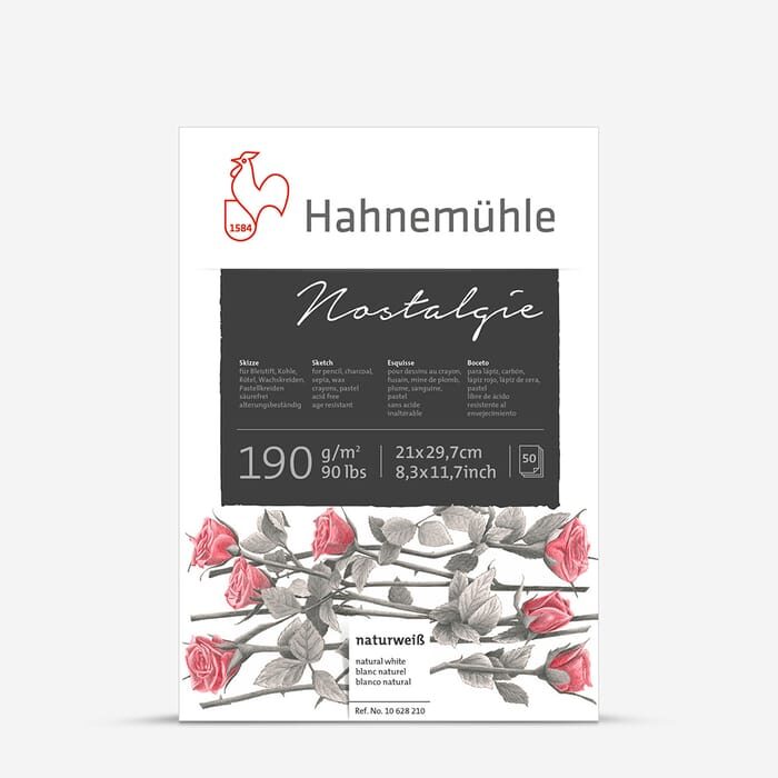Hahnemühle Nostalgie este un bloc de hârtie premium de 190 g/m², în nuanță alb natural, recunoscut pentru textura sa plăcută și granulația fină. Suprafața subtil granulată oferă o aderență excelentă a pigmentului și permite obținerea unor linii clare, intense și precise. Datorită finisajului rafinat, instrumentul de desen alunecă ușor pe hârtie, facilitând controlul liniei și realizarea hașurilor delicate.
