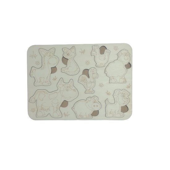 Setul educational pentu copii este realizat din placa din lemn natur pe care sunt sculptate diferite animale.